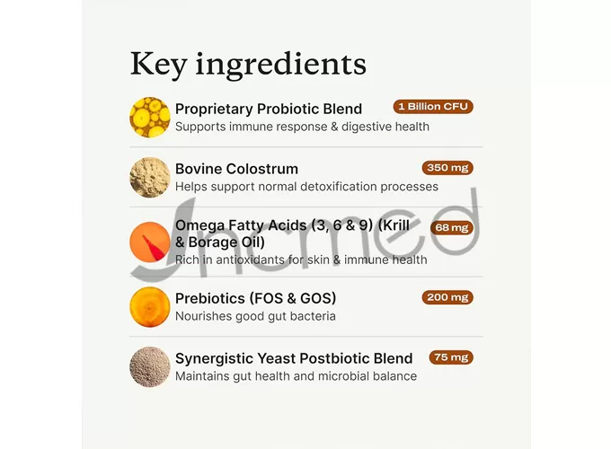Comprehensive gut microbiome modulation: Contains prebiotics and postbiotics to promote the growth of beneficial bacteria and balance the gut flora, addressing the root causes of ear odor and paw licking caused by digestive and yeast imbalances.