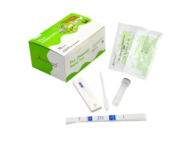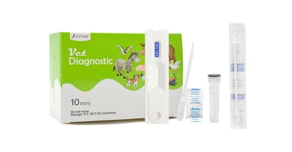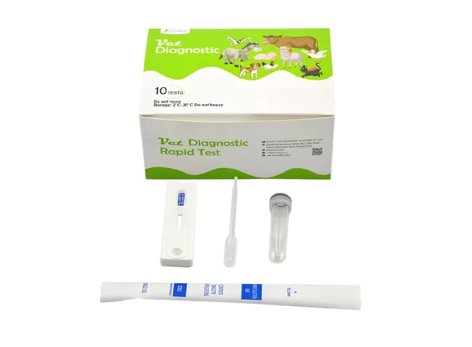 The kit has high sensitivity and accuracy, fast and intuitive results, reasonable price and excellent quality, making it an ideal choice for veterinary clinical diagnosis and pet health management. Its ready-to-use design includes a test card, cotton swab, buffer diluent and instructions, allowing users to test at any time.