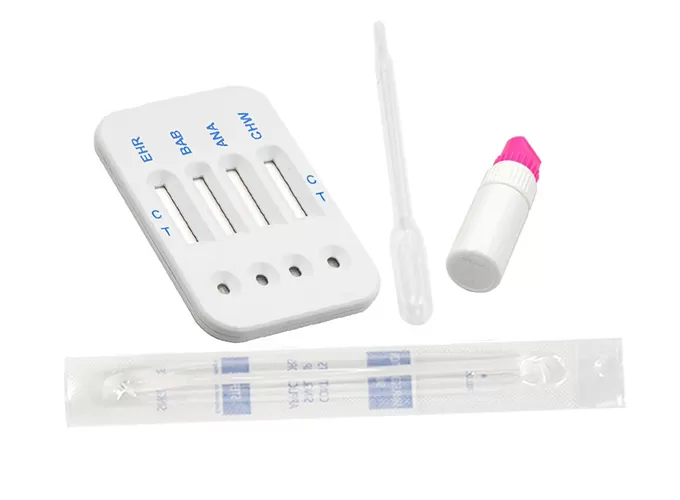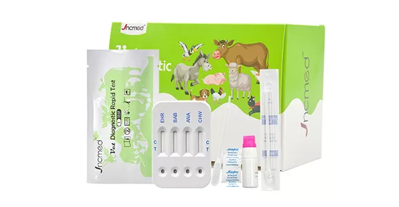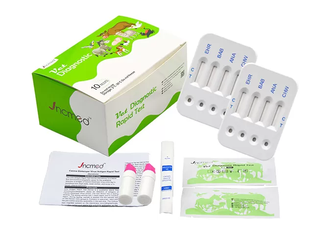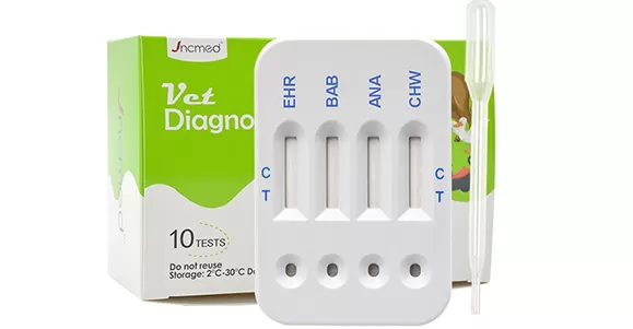 Detection of EHR antibodies is crucial for clinical diagnosis, especially for dogs with unexplained fever, anemia, thrombocytopenia, and multiple organ dysfunction. The lateral flow immunochromatography kit can quickly and qualitatively detect EHR antibodies in serum, plasma, or whole blood by pre-coating recombinant antigens. If antibodies are present in the sample, they will bind to the test line (T line) and develop color, and the results can be read within 15-20 minutes. The technology is easy to use and suitable for on-site screening, but it needs to be combined with PCR or blood smear microscopy for further diagnosis.
