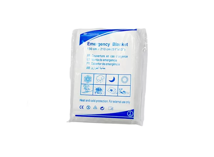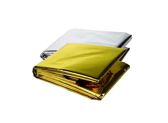 The emergency blanket is a lightweight and practical emergency equipment made of aluminized polyester film material with excellent warmth and protection. Its double-sided design gives it multiple uses: the gold side facing outward can reflect human body heat to help those with hypothermia maintain body temperature; the silver side facing outward can reflect external heat to provide protection for burns or overheating. This emergency blanket measures 1.6 meters by 2.1 meters and weighs only 45 grams. It is compact when folded and can be easily put into a pocket or emergency bag. It is very suitable for outdoor activities and emergency situations.
