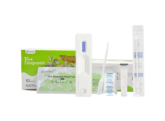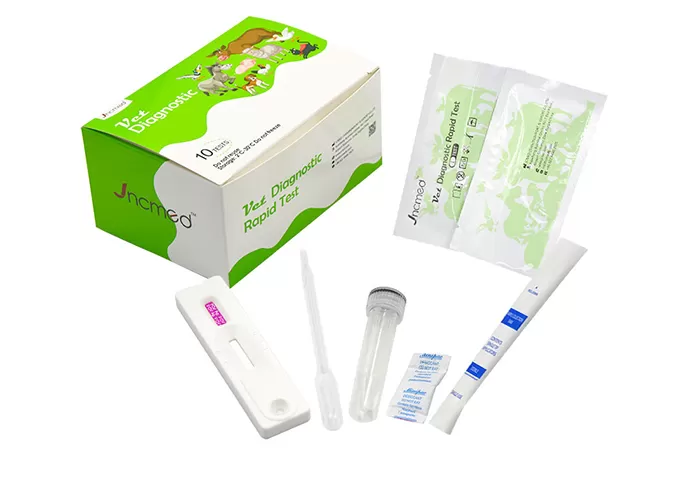 Feline Calicivirus Antigen (FCV Ag) Test Kit is a rapid test tool based on lateral flow immunochromatography, designed for the qualitative detection of feline calicivirus antigens in cat eye, nasal and anal secretions. The kit is easy to operate and has rapid results, and is suitable for early screening of feline calicivirus infection in clinical and home settings. Through high specificity and high accuracy detection, it can help veterinarians and pet owners to detect infection in time, so as to take appropriate treatment and management measures.