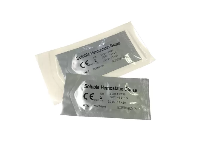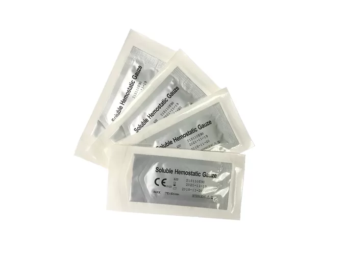 Soluble hemostatic dressing is a white or light yellow knitted fabric with uniform color, good water solubility and soft texture. It is made of chemically modified regenerated cellulose woven fabric, and its main component is sodium carboxymethyl cellulose. Soluble hemostatic dressing can quickly absorb the exudate on the wound surface, forming a viscous and transparent gel-like substance, which is convenient for observing the wound. It is suitable for covering wounds after various types of wounds and postoperative bleeding, and can stop bleeding immediately and quickly, protect the wound and postoperative wound area, and promote rapid healing.