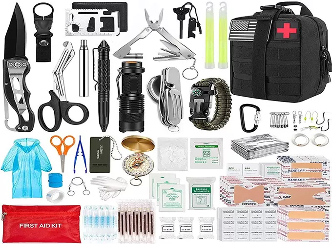 Comprehensive Medical and Survival Tools: This first aid kit includes a wide range of essential items such as medical bandages, antiseptic wipes, alcohol pads, scissors, a flashlight, multi-tool, safety gloves, and a compass, making it suitable for both medical emergencies and outdoor survival situations.